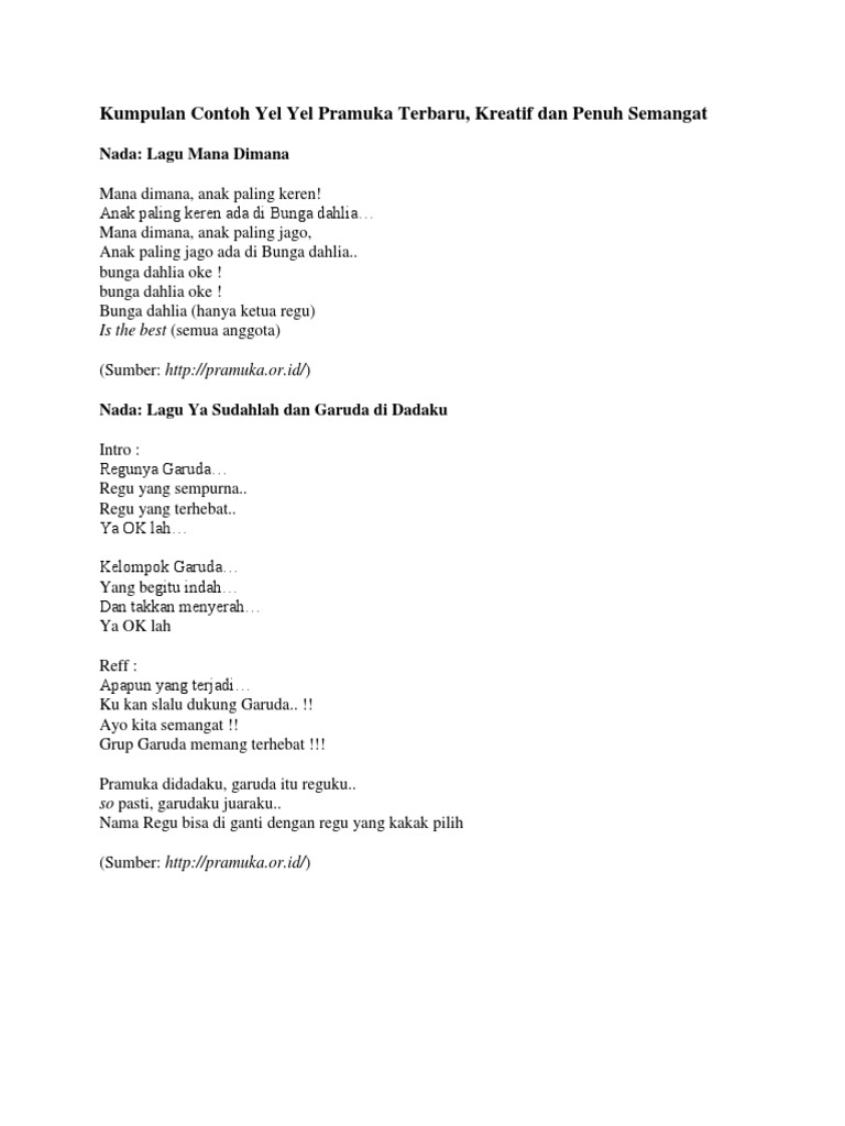 Beberapa kegiatan yang kerap menggunakan yel yel adalah pramuka Mos Ospek PLS hingga outbond. Berikut contoh kreasi yel-yel. Admin mengumpulkan data tentang Contoh Yel Yel Untuk Anak Sd.