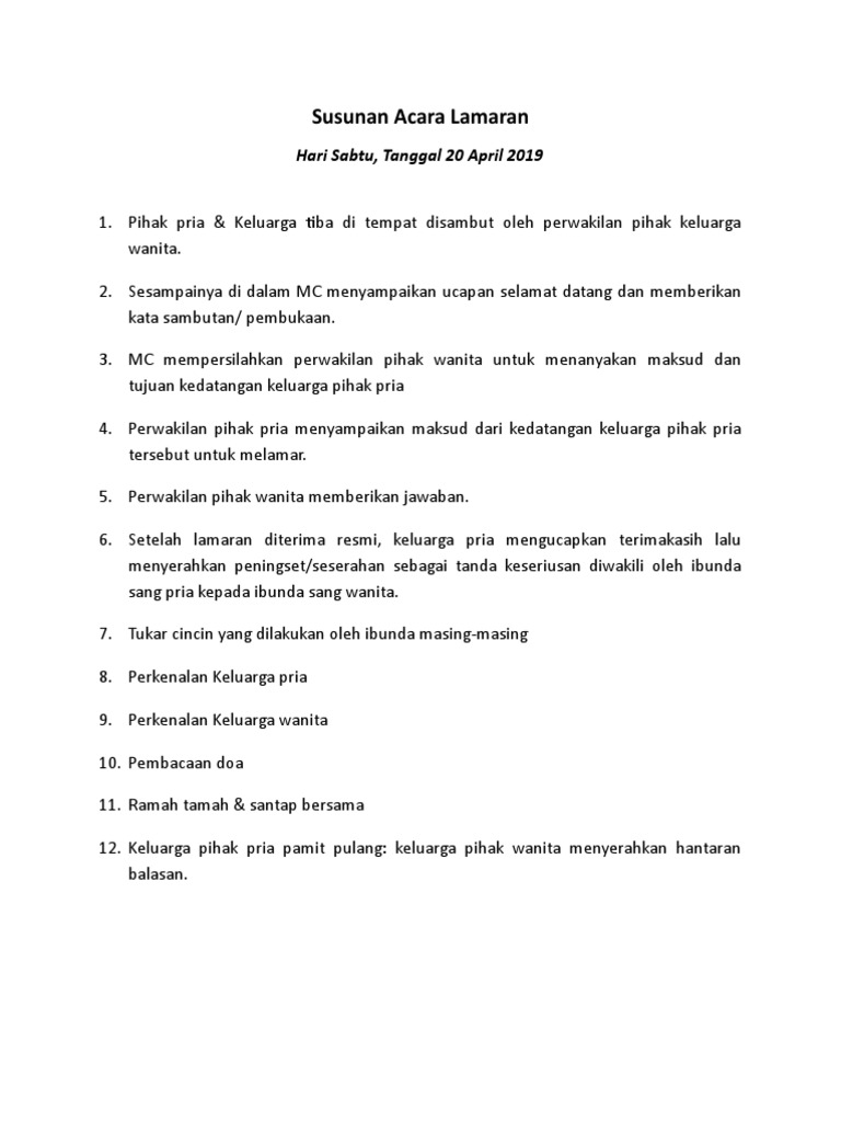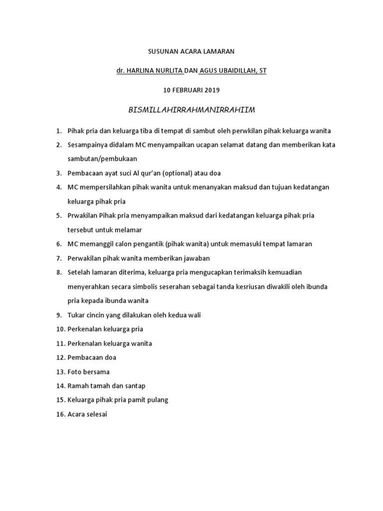 Jangan Bingung Ini 9 Susunan Acara Lamaran Pernikahan. Here we go. Pembukaan acara oleh MC 2Pengutaraan maksud dan tujuan kedatamgan keluarga bapak marullah kepada keluarga bapak amri amir 3Jawaban atas maksud dan tujuan kedatangan keluarga bapak marullah 4Doa penutup 5Acara lain-lainramah tamah.