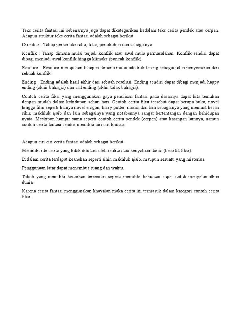 Pada cerita fantasi total seluruh peristiwanya merupakan khayalan dan tidak terjadi di dunia nyata. Pengertian Cerpen Beserta Ciri Dan Unsur-Unsurnya Struktur Teks Cerita Fantasi. Mengutip dari buku Pengkajian Prosa Fiksi karya Andri Wicaksono kata fiksi dalam bahasa Indonesia merupakan terjemahan dari bahasa.